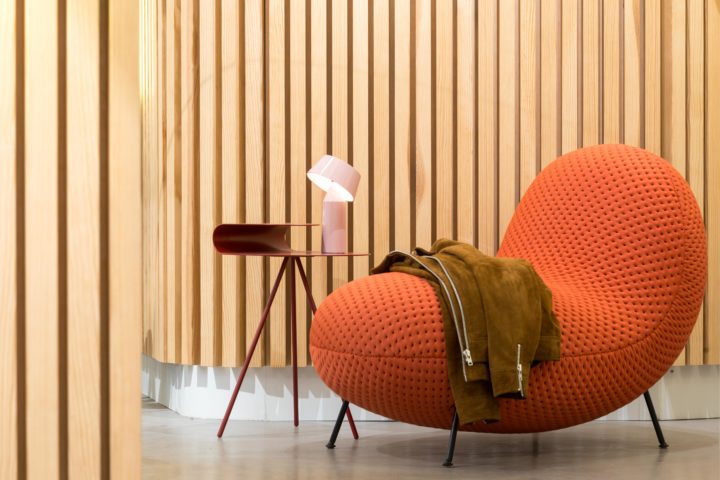 Shooting chez melville avec Gabrielle Voinot – bardage bois et chaud froid des lumières – lors de la mise en place de la nouvelle scénographie en novembre. melville installera le fauteuil BABA au siège d’une célèbre maison de luxe française en décembre prochain.