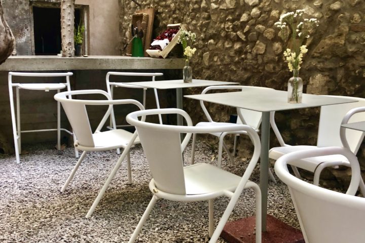 L’iconique chaise Portugaise 5008 de la maison ADICO et les tables Terrazzo de la marque HAY ont été choisies pour l’occasion.